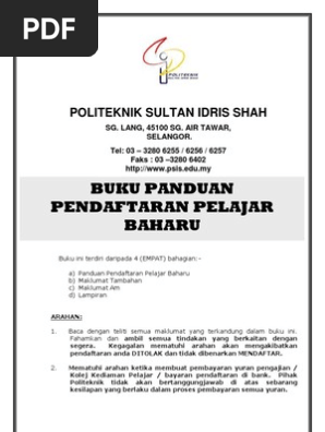 6 20 HARI PENDAFTARAN 21 Tarikh dan waktu pendaftaran di Politeknik Sultan Idris Shah adalah seperti yang dinyatakan dalam surat iringan daripada Politeknik Sultan Idris Shah. 1 politeknik tuanku syed sirajuddin pauh putra 02600 arau perlis tel. Buku panduan pendaftaran pelajar baharu sesi disember 2019 politeknik tuanku syed sirajuddin pauh putra arau perlis tel.