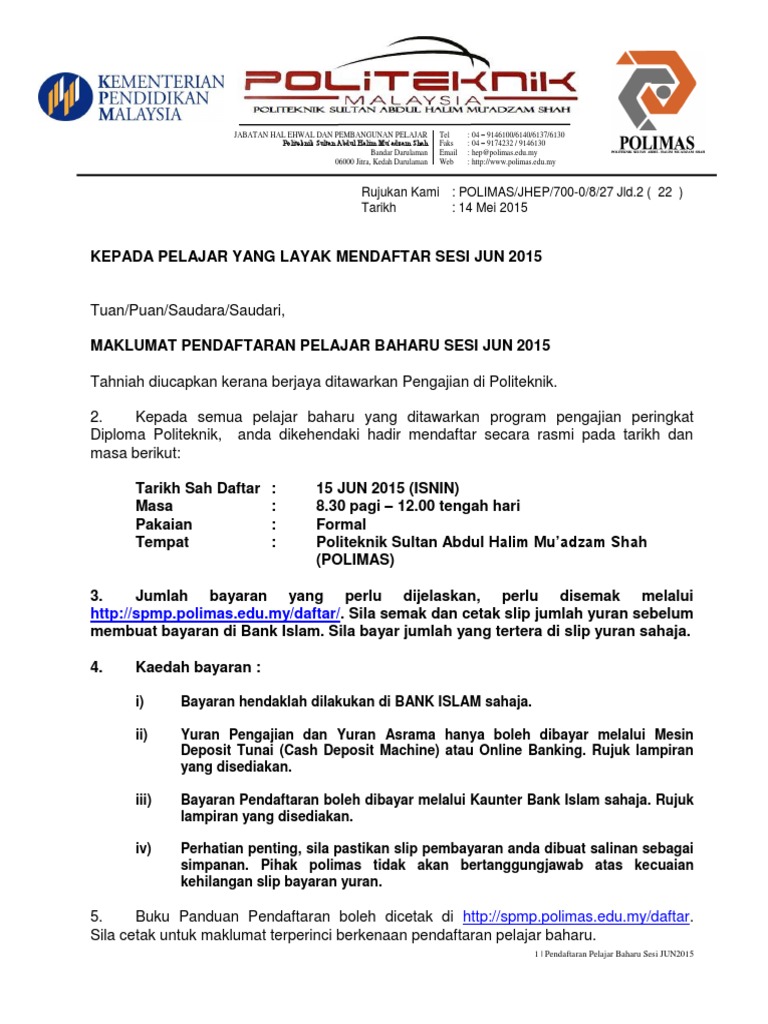 . Membuat bayaran yuran Rujuk Jadual dan Kaedah Bayaran di ms 5 - 9 Lengkapkan Borang HEP1-HEP6 Cetak Borang HEP 1 6 di ms 15- 24 Lapor diri di Politeknik pada Hari Pendaftaran dengan membawa. D Pelajar yang mendapat tajaan daripada mana-mana agensi kerajaan atau. Panduan untuk ke politeknik sandakan sabah 5.